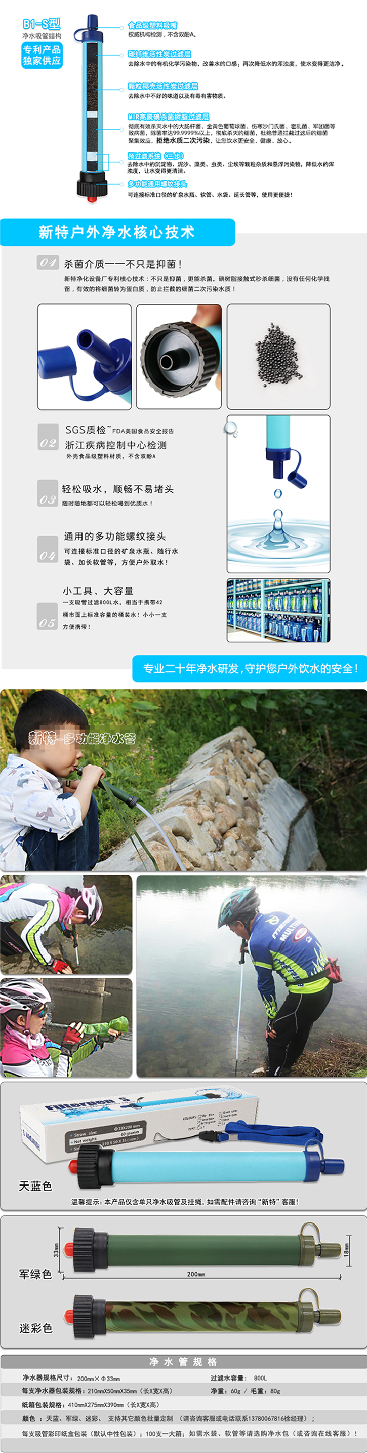 • B3-S型多功能便携式户外净水器 个人野外生存净水吸管 B3-S型多功能便携式户外净水器 个人野外生存净水吸管 B3-S型微型户外单兵净水器采用高精度亲水性超滤膜+颗粒椰壳与碳纤维活性炭过滤层+高聚碘杀菌树脂过滤层结构,规格尺寸200×Φ33mm,重量净重60g毛总80g,包装规格21X5X3.5cm,使用寿命2000L,颜色为天蓝色,军绿色,藏青色等多种可选.