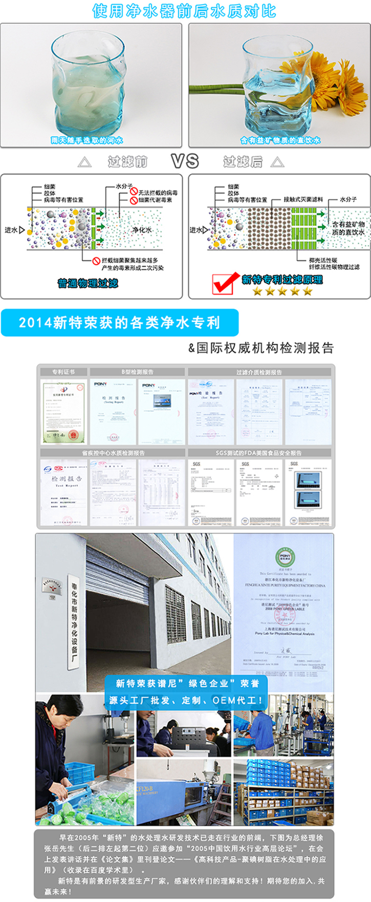 产品结构:高聚碘杀菌树脂过滤层+颗粒椰壳活性炭过滤层+碳纤维活性炭过滤层+多功能通用螺纹接头(结构图详见下文中净水吸管结构)