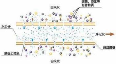 超滤是一种加压膜分离技术,即在一定的压力下,使小分子溶质和溶剂穿过一定孔径的特制的薄膜,而使大分子溶质不能透过,留在膜的一边,从而使大分子物质得到了部分的纯化。超滤原理也是一种膜分离过程原理,超滤利用一种压力活性膜,在外界推动力(压力)作用下截留水中胶体、颗粒和分子量相对较高的物质,而水和小的溶质颗粒透过膜的分离过程。通过膜表面的微孔筛选可截留分子量为3x10000—1x10000的物质。当被处理水借助于外界压力的作用以一定的流速通过膜表面时,水分子和分子量小于300—500的溶质透过膜,而大于膜孔的微粒、大分子等由于筛分作用被截留,从而使水得到净化。也就是说,当水通过超滤膜后,可将水中含有的大部分胶体硅除去,同时可去除大量的有机物等。