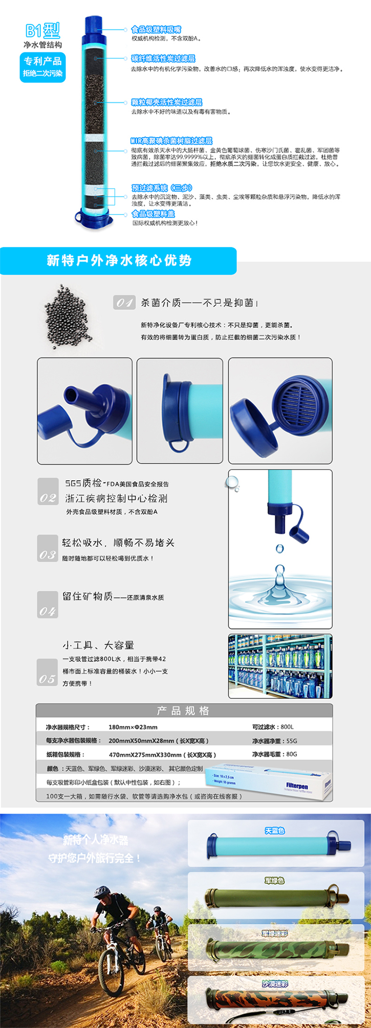 B3型户外个人生存净水器采用高聚碘杀菌树脂过滤层+颗粒椰壳活性炭过滤层+碳纤维活性炭过滤层+高精度亲水超滤膜结构,规格尺寸180×Φ23mm,重量净重55g毛总70g,颜色为天蓝色,深蓝色,军绿色等多种可选,使用寿命2000L.