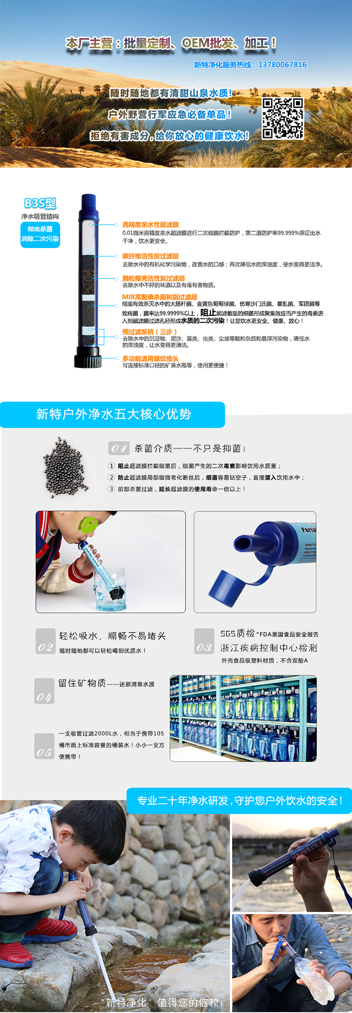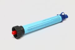 B3型户外个人生存净水器采用高聚碘杀菌树脂过滤层+颗粒椰壳活性炭过滤层+碳纤维活性炭过滤层+高精度亲水超滤膜结构,规格尺寸180×Φ23mm,重量净重55g毛总70g,颜色为天蓝色,深蓝色,军绿色等多种可选,使用寿命2000L.